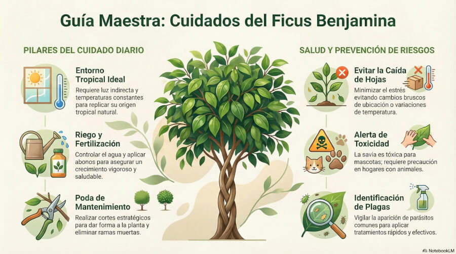 El ficus benjamina requiere estabilidad ambiental y un equilibrio correcto entre luz, riego y temperatura. La mayoría de los problemas que presenta esta planta no se deben a enfermedades, sino a desajustes en sus cuidados básicos.